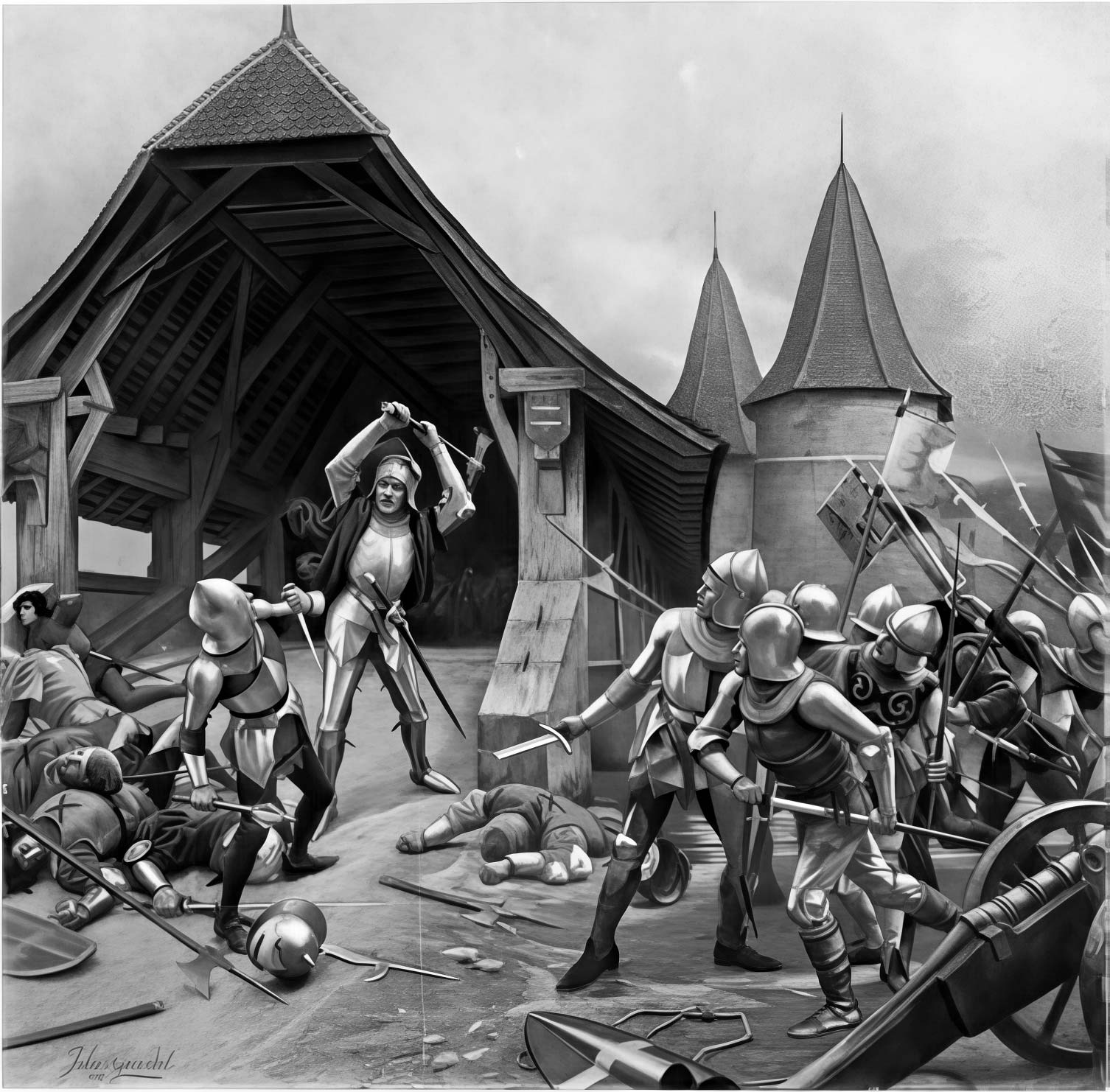 “Already a considerable number of Savoyards had gone to make their passage over the defenselessBridge of Thielle, when Jacques Baillod, banneret* of Neuchatel, a very tall man, rushed alone towardthe enemy. Armed for war, equipped with a battleaxe and protected by his shield, he threw himselfon the enemy crying: “For the children of the canton!” Jacques Baillod victoriously defended theBridge of Thielle against the Count of Romont, his battleaxe spreading terror in the ranks of theSavoyards and giving death to all it reached. After long resistance and superhuman efforts, our hero,like Horatius Cocles did on the Bridge of Sublicius at Rome, put to flight that mob of warriors who,all well armed, had rushed like madmen at this courageous Neuchatelois.